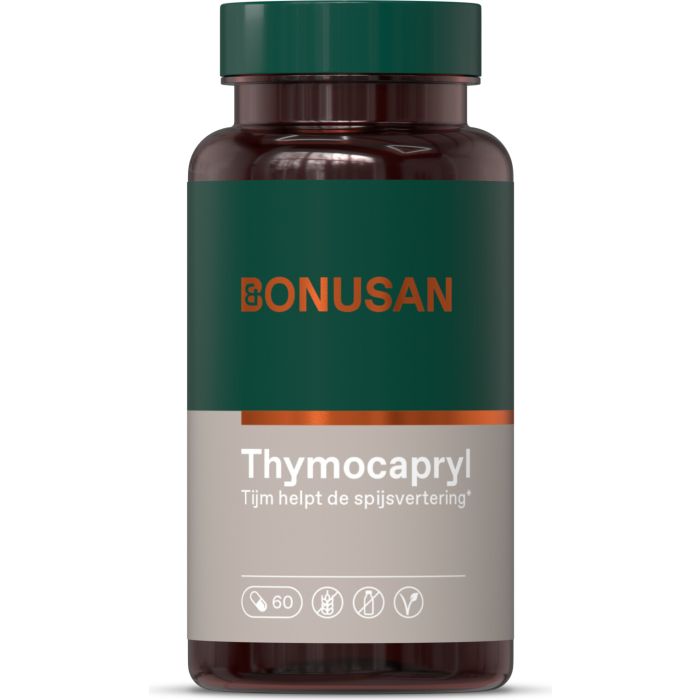 Bonusan Thymocapryl is een voedingssupplement dat caprylzuur bevat, wat kan bijdragen aan een evenwichtig milieu in de darmen. Het ondersteunt de gezonde functies van de darmen zonder schadelijke effecten. Dit product is geschikt voor diegenen die op zoek zijn naar natuurlijke ondersteuning voor hun spijsvertering.