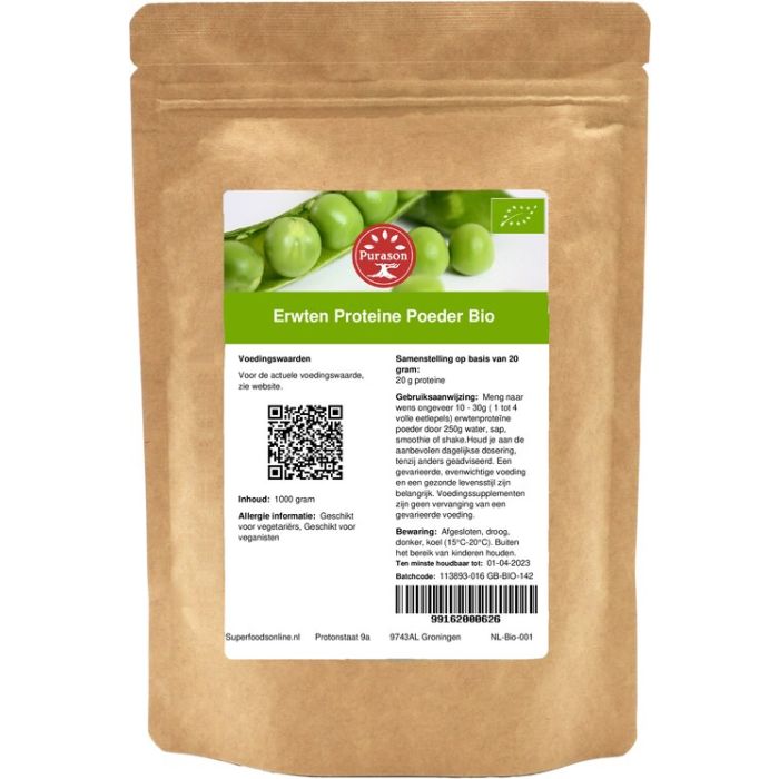 Purason biologisch gecertificeerde erwten proteïne poeder bestaat voor 78% uit eiwit.