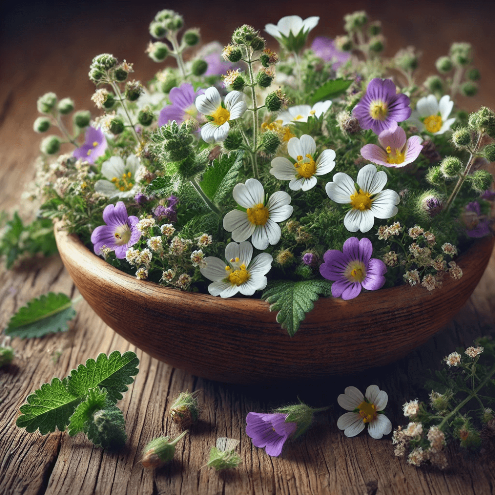 De plant heeft kleine witte of paarse bloemen met een gele kern en wordt al eeuwenlang in de kruidengeneeskunde gebruikt.