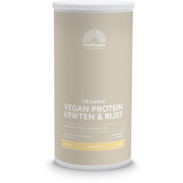 Erwteneiwit, rijsteiwit, natuurlijke vanille-aroma, biologische steviasuiker.