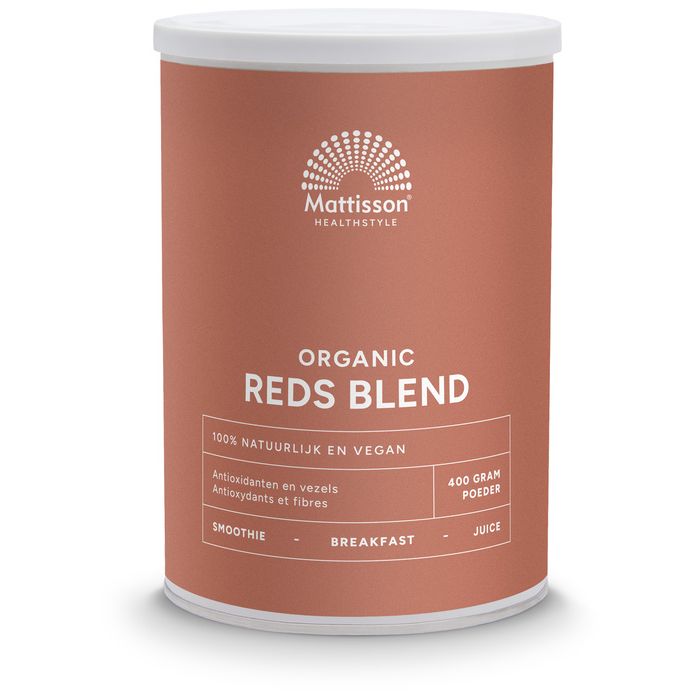 Biologische rode bessenpoeder, biologische rode bietenpoeder, biologische spirulina, biologische maca poeder, biologische acai poeder, biologische rietsuiker. Hulpstoffen: geen.