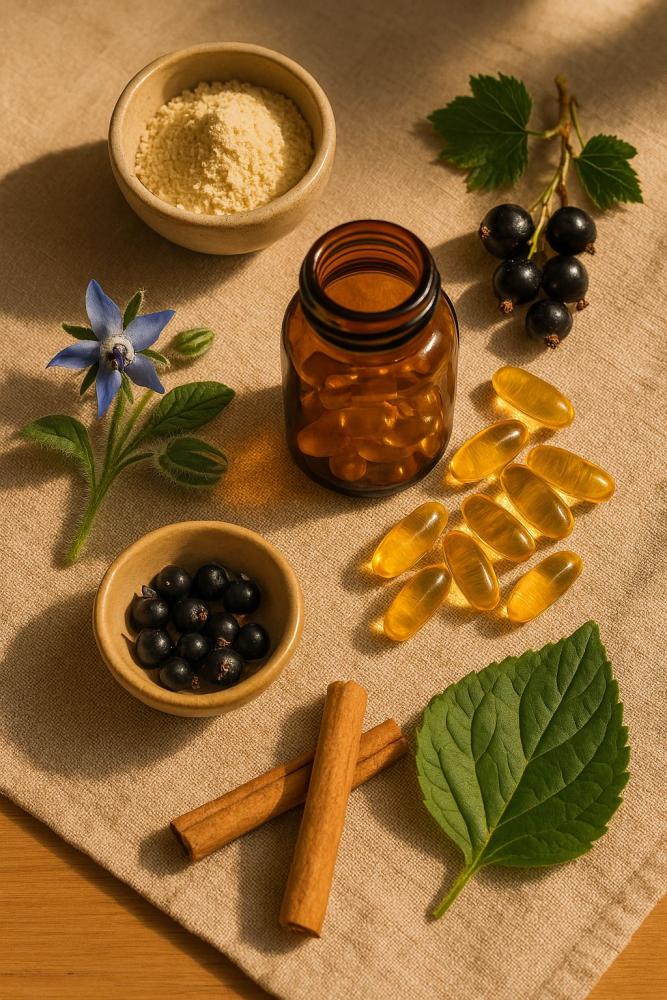 • Borage (Bernagie) – Een plant met blauw-paarse bloemen; de olie bevat GLA (gamma-linoleenzuur), een omega-6 vetzuur.